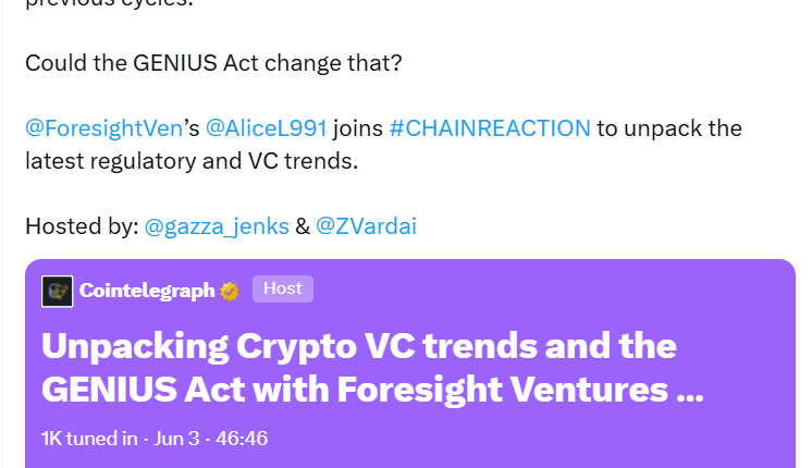 Speaking during Cointelegraph’s Chain Reaction X Spaces show on June 3, Li said the crypto market’s 2025 rally had been driven mainly by shifting US policy.