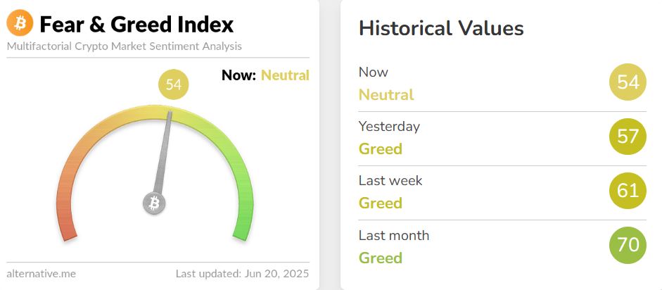 Meanwhile, another sentiment-tracking tool, the Crypto Fear & Greed Index, dropped to a score of 54 out of 100 on Friday, bringing the market attitude from “Greed” to “Neutral.”