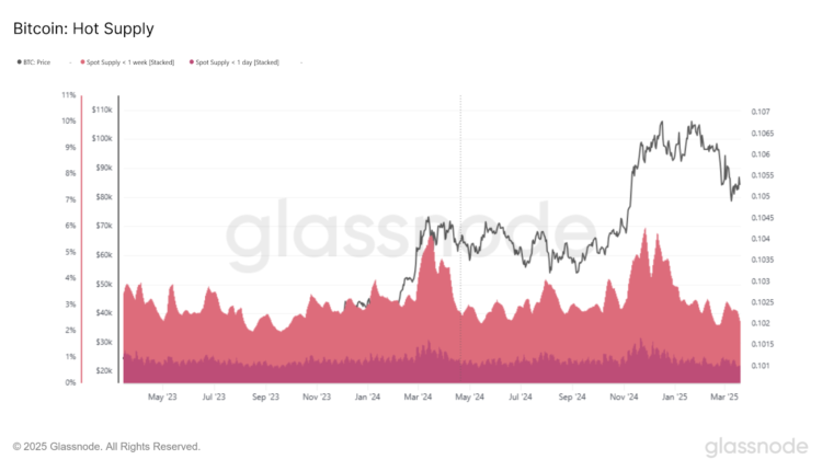 Bitcoin’s hot supply metric, which measures the Bitcoin (BTC) aged one week or less, is down over 50%, from 5.9% at the end of November to just 2.3% on March 20, Glassnode data shows.