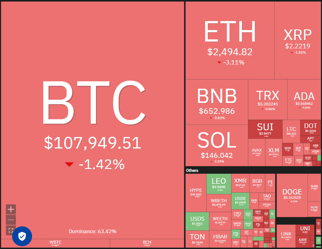 Bitcoin’s (BTC) failure to close above $110,000 may have attracted profit-booking by short-term traders. That has pulled the price near $108,000. Crypto analyst Daan Crypto Trades said in a post on X that a close above $110,000 would be good for Bitcoin, but a drop below $108,000 could deepen the correction.