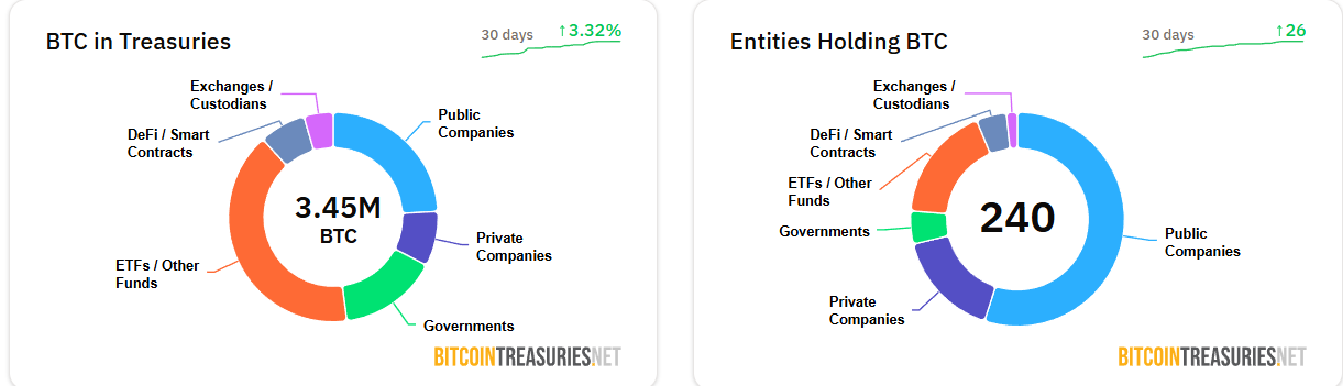 At least 240 public companies now hold Bitcoin on their balance sheets, up from 124 firms just weeks ago, accounting for about 3.96% of the total BTC supply, according to BitcoinTreasuries.NET.