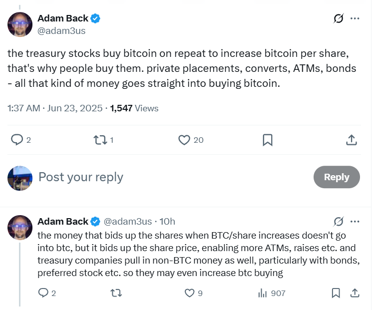 Bitcoin treasury firms are buying BTC “on repeat to increase Bitcoin per share,” tapping into different funding methods such as convertible note offerings to accumulate more of the world’s first cryptocurrency, making them attractive for investors, Back explained.