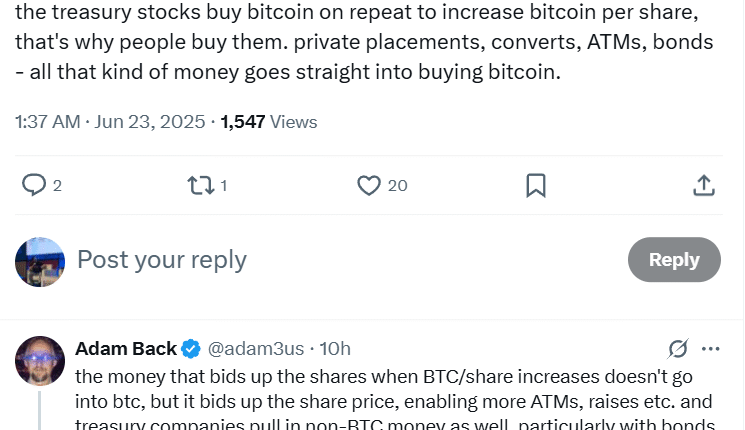 Bitcoin treasury firms are buying BTC “on repeat to increase Bitcoin per share,” tapping into different funding methods such as convertible note offerings to accumulate more of the world’s first cryptocurrency, making them attractive for investors, Back explained.
