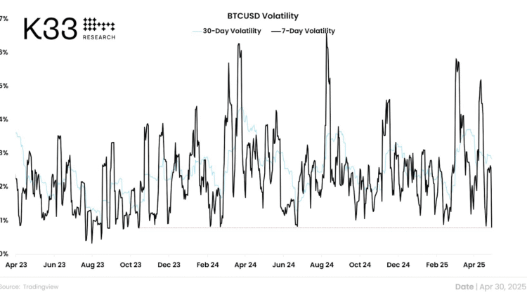 Bitcoin (BTC) weekly volatility hit a 563-day low on April 30, said Vetle Lunde, the head of research at K33 Research.