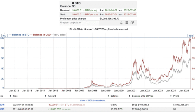 A Bitcoin wallet “12tLs” transferred 10,000 Bitcoin (BTC) worth over $1 billion after 14 years of holding the assets on Thursday.