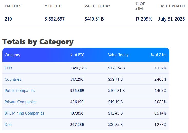 There are 219 entities that combined hold 3.6 million Bitcoin, worth over $419 billion, according to Bitbo data. This includes exchange-traded funds, countries, public and private companies, Bitcoin mining companies and DeFi.