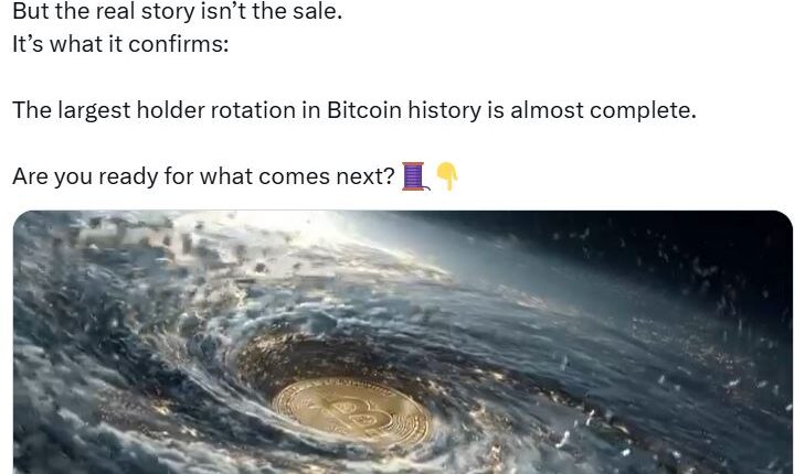 In an X post on Wednesday, Bitcoin financial services company Swan Bitcoin said the largest rotation in Bitcoin (BTC) history is almost complete as the “old guard are being replaced by new titans with conviction,” such as corporations and treasury firms.