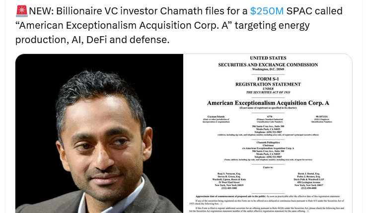 Early Bitcoin investor and billionaire Chamath Palihapitiya has filed to raise $250 million in blank-check company “American Exceptionalism Acquisition Corp A,” targeting the decentralized finance, AI, energy and defense sectors.