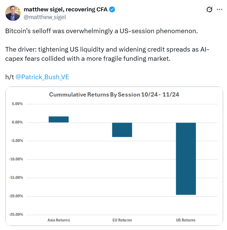 Matthew Sigel, head of digital assets research at investment manager VanEck, said on Monday that Bitcoin’s recent sell-off, which saw the token drop to lows of around $82,000, was “overwhelmingly a US-session phenomenon.”