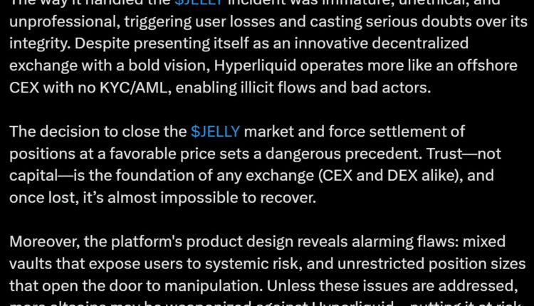 “The decision to close the $JELLY market and force settlement of positions at a favorable price sets a dangerous precedent,” Chen said. “Trust—not capital—is the foundation of any exchange […] and once lost, it’s almost impossible to recover.”