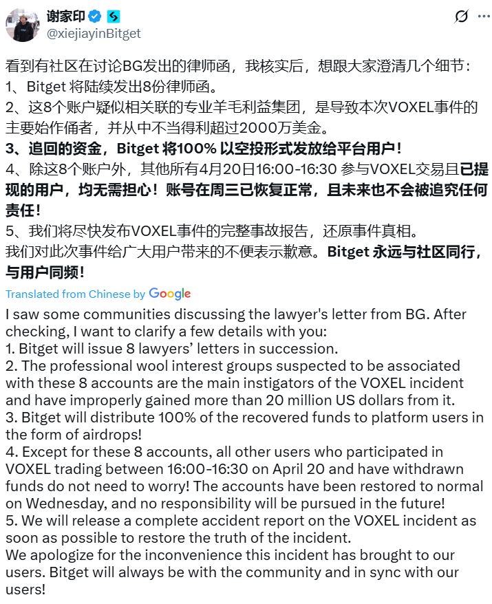 Eight account holders that the exchange accuses of being involved in the April 20 incident and who allegedly pocketed $20 million between them will receive a letter from the exchange’s lawyers in “quick succession,” Xie Jiayin, Bitget’s head of Chinese operations, said in an April 27 X post.