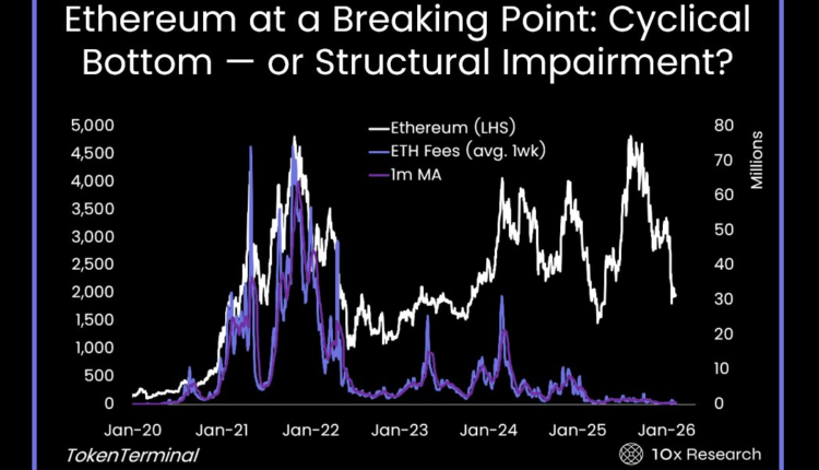 Crypto research outlet 10x Research said Monday that Ethereum is now trading near valuation and cost-basis levels that test whether the asset is simply in a cyclical downturn or entering a period of deeper, structural weakness.