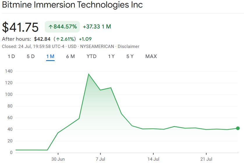 Days after announcing its plans to buy Ether, Bitmine stock (BMNR) skyrocketed more than 3,000% to an all-time high of $135 on July 3.