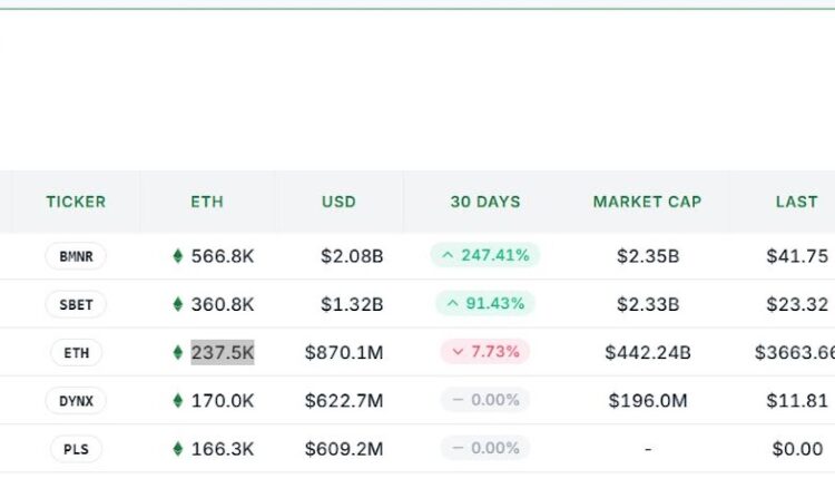 Bitcoin mining firm BitMine Immersion Technologies has bought up over $2.1 billion of Ether in just 16 days, retaking the lead among a flurry of newly formed Ether treasury companies.