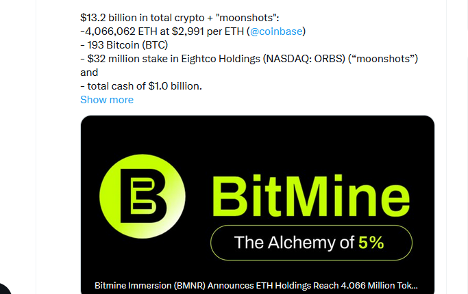Bitmine Surpasses 4M ETH Holdings After $40M Buy