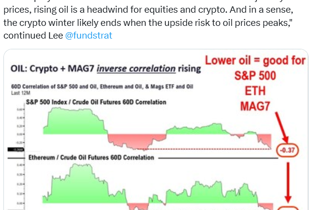 “The inverse correlation of crypto and equities to oil has been increasing and is at the highest levels in the past year,” Lee said.