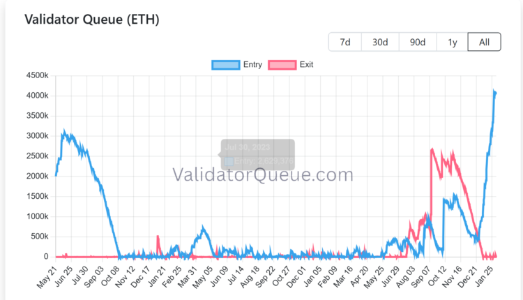 Ethereum validator queue data shows a surge in demand to stake Ether (ETH). The entry queue has swelled to more than 4 million ETH, translating into a wait time of over 70 days.