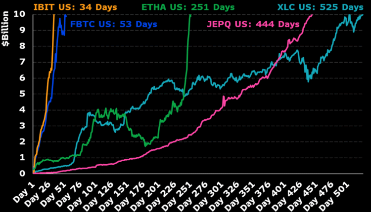 The milestone puts ETHA well ahead of the JPMorgan Nasdaq Equity Premium Income ETF (JEPQ), which took 444 days to hit the same mark and currently ranks as the fourth fastest-growing ETF on record.