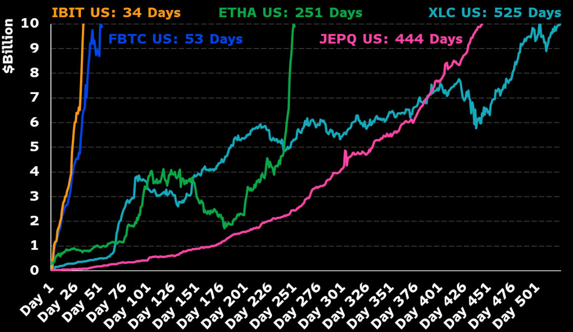 NovaDius Wealth Management president Nate Geraci said that the three fastest ETFs to hit the $10 billion mark are now all spot crypto ETFs, highlighting their unprecedented growth speed compared to traditional finance.