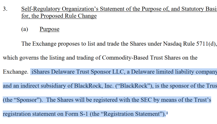 Nasdaq filed the 19b-4 form to securities regulator on behalf of the $9 trillion asset management firm for a proposed ETF called the “iShares Ethereum Trust.”
