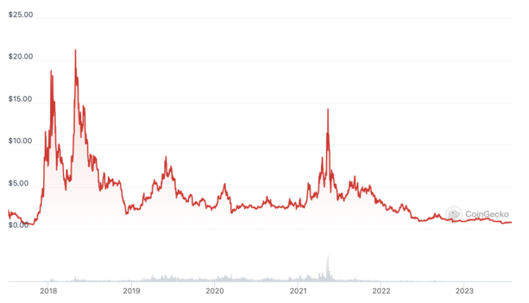 By the end of its year-long crowdsale, EOS was trading at around $12, or around 44% down from its peak price recorded in April 2018. The cryptocurrency then experienced a couple of ups and downs, eventually plummeting all the way down below $1. At the time of writing, EOS is trading at $0.74, down roughly 30% over the past year.
