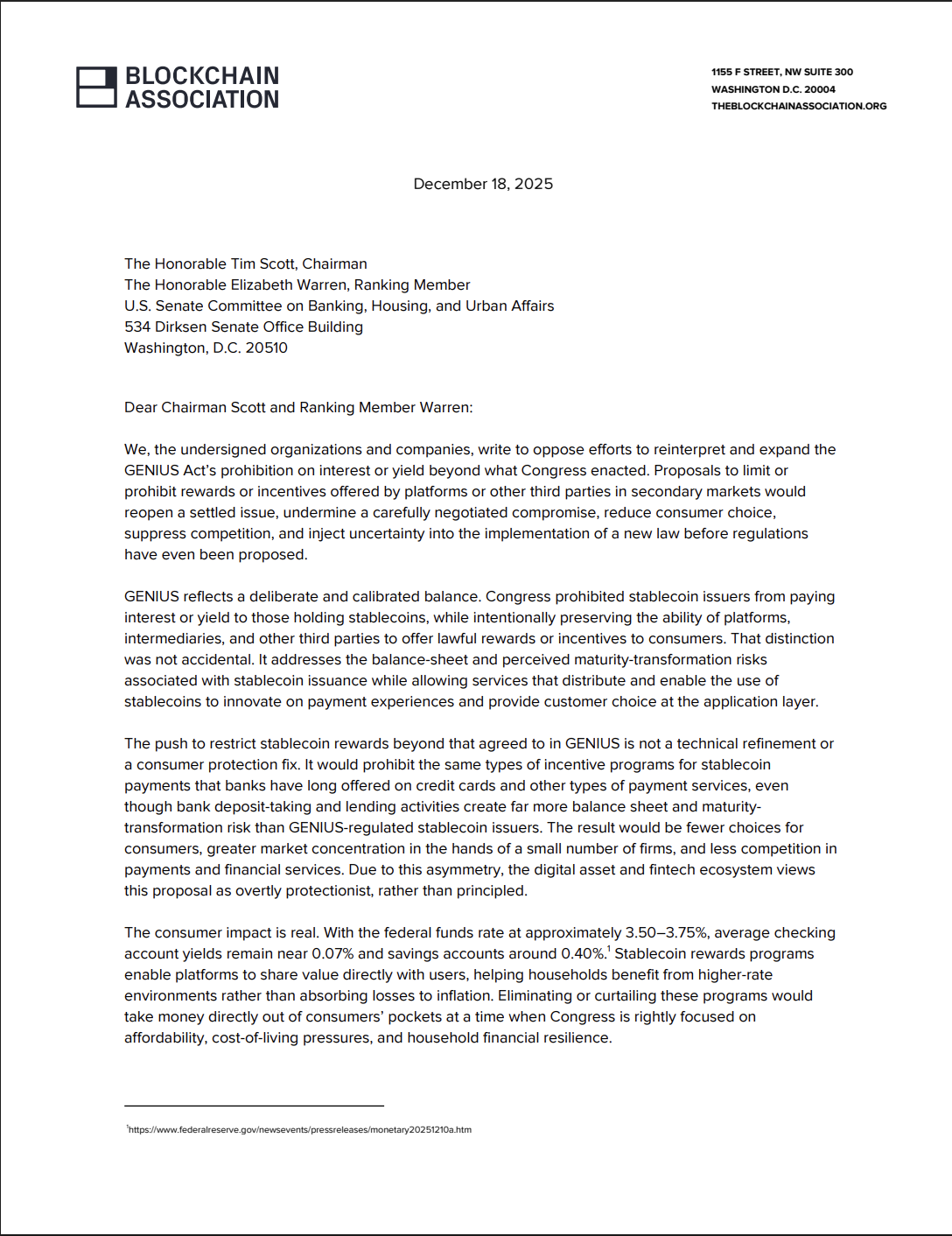 The letter opposes efforts to stop crypto platforms from sharing yield with customers. Source: The Blockchain Association