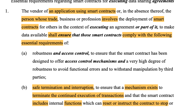 In its current form, the Data Act stipulates that smart contracts must have the capability to be “interrupted and terminated,” and it mandates controls that allow for the resetting or halting of the contract. The stipulation appears to be a significant departure from the blockchain’s foundational ethos of decentralization.