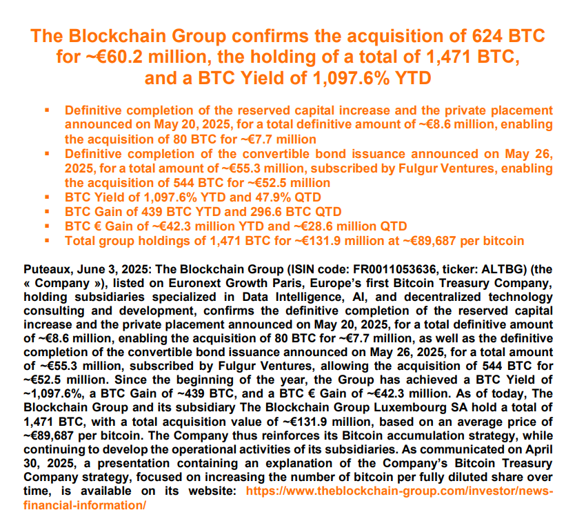 The latest acquisition brings the firm’s total holdings to 1,471 Bitcoin, or over $154 million, with a BTC yield of 1,097.6% YTD, the Blockchain Group announced in a June 3 X post.