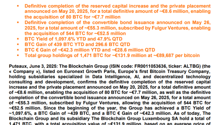 The latest acquisition brings the firm’s total holdings to 1,471 Bitcoin, or over $154 million, with a BTC yield of 1,097.6% YTD, the Blockchain Group announced in a June 3 X post.