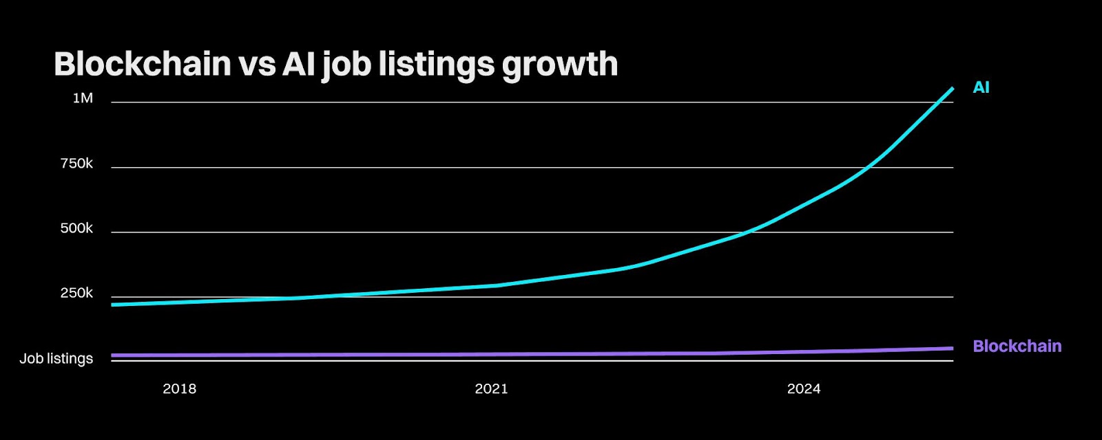 AI-related job listings have risen between 75% and 100% year-over-year, while blockchain job growth remains around the 45% to 60% growth range.