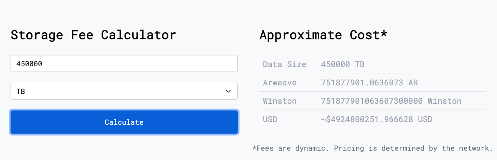 450,000 TB of raw DNA data would cost nearly half a billion dollars to upload to Arweave. Source: Arweave Fees