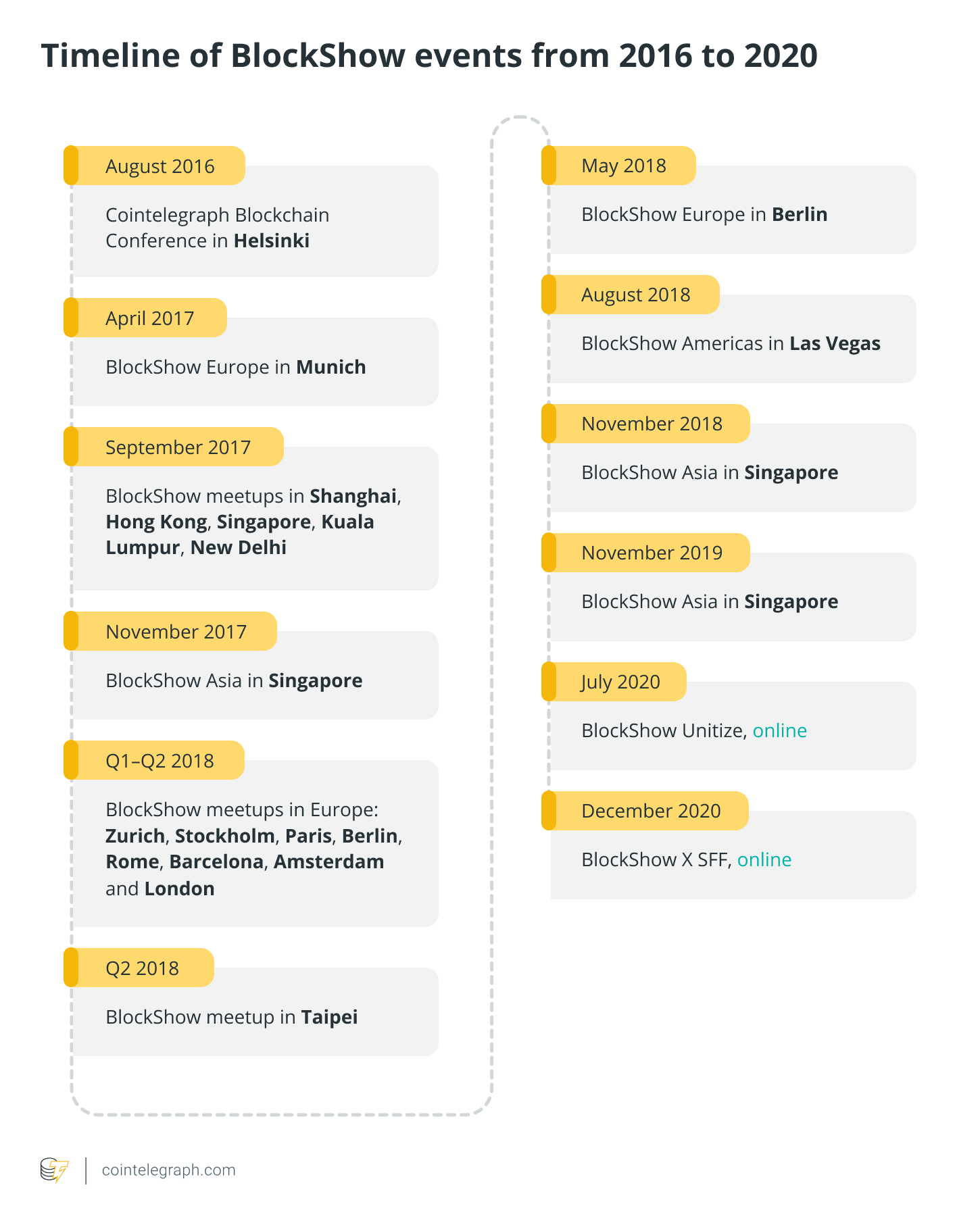 BlockShow has since organized three in-person events in Singapore in 2017, 2018 and 2019. In 2018, it hosted the BlockShow Americas conference in Las Vegas. Like many other global events, BlockShow paused its in-person conferences amid the height of the pandemic but continued hosting multiple online events in 2020.
