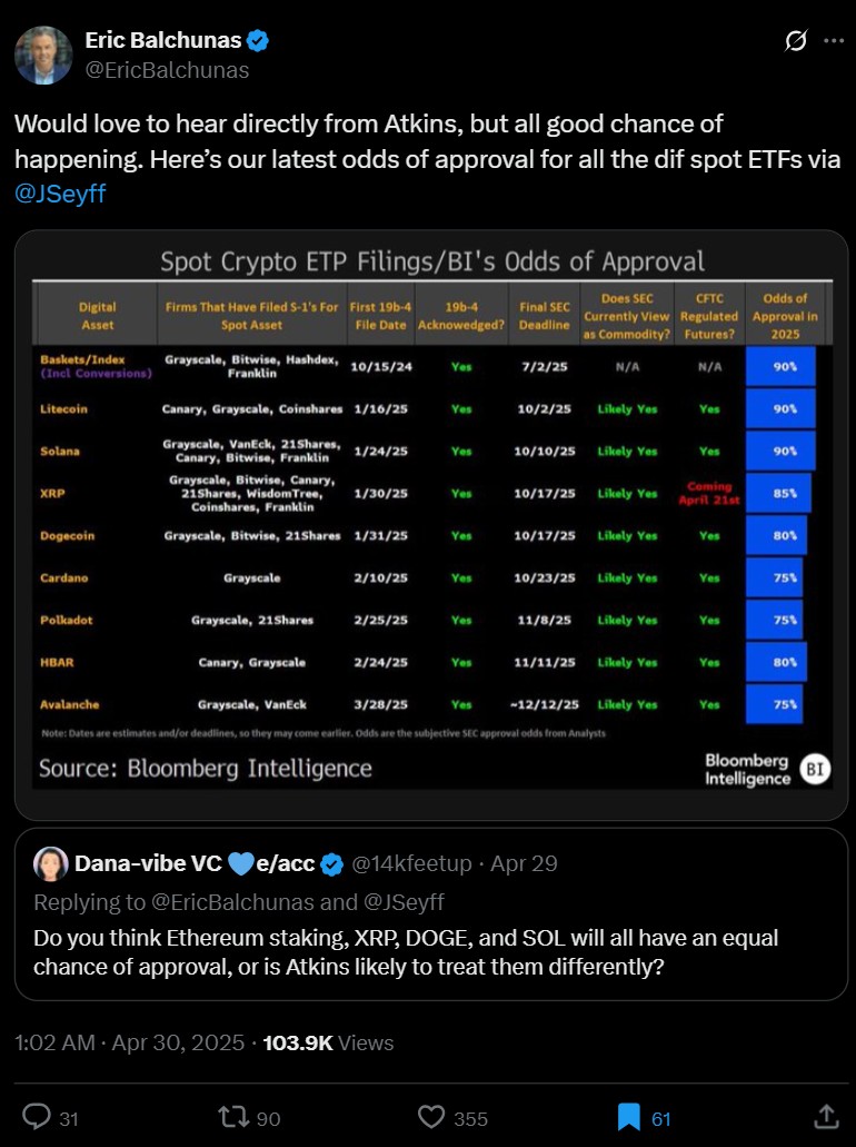 Bloomberg Intelligence has boosted its estimated odds of US regulators approving a Solana exchange-traded fund (ETF) in 2025 to 90%, according to an April 30 post on the X platform.