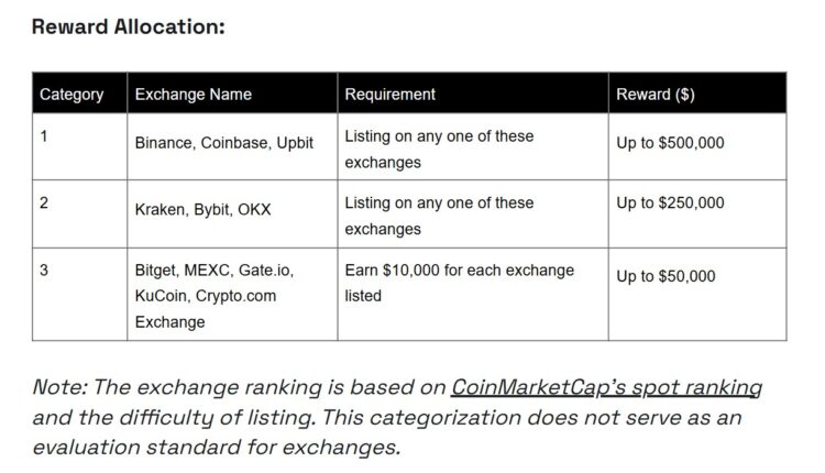 The largest rewards — $500,000 in permanent liquidity — are reserved for projects that list on major CEXs such as Binance and Coinbase, it said.