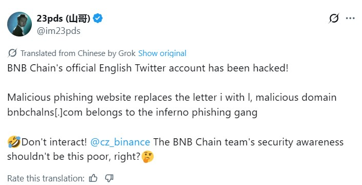 “BNB Chain’s English official X account has been hacked! The phishing website changed the letter i into l,” 23pds posted, warning users not to be deceived. The security professional also suggested that the malicious domain belongs to the infamous Inferno phishing group.