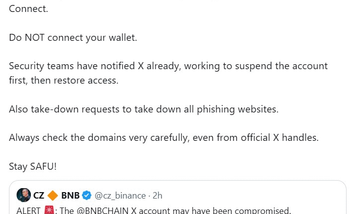 Binance founder Changpeng “CZ” Zhao confirmed the incident, warning his followers not to interact with the malicious posts containing phishing links. “The hacker posted a bunch of links to phishing websites that ask for Wallet Connect. Do NOT connect your wallet,” CZ wrote.