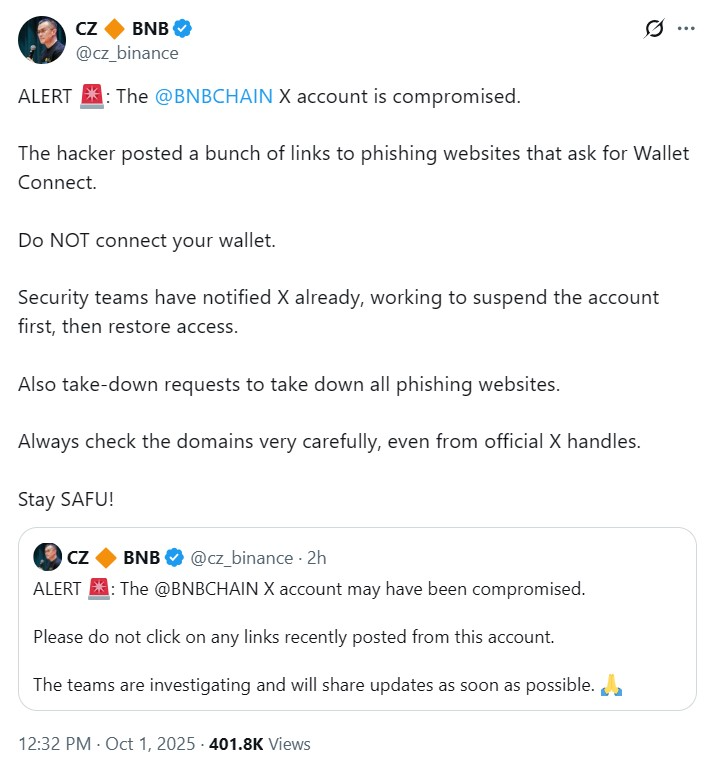 He added that BNB Chain’s security teams have notified X and are working to suspend the account and restore access. Zhao said takedown requests for the phishing sites have already been submitted.