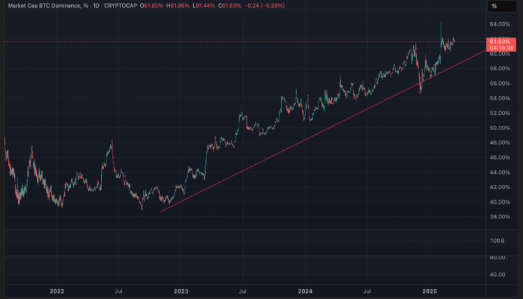 The current BTC market dominance is roughly 61.6%, down from the local peak of 64.3% recorded on Feb. 3.