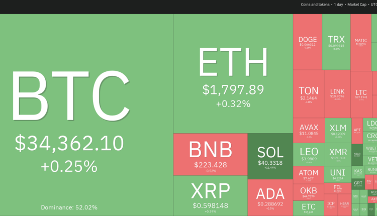 The relative strength index (RSI) is still in the overbought zone, indicating that the consolidation may extend for a few more days. The important level to watch on the upside is $35,280 and on the downside is $33,390.