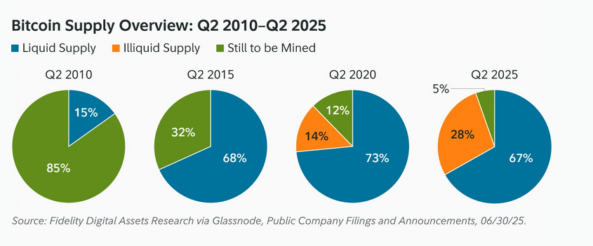“At the close of Q2 2025, Bitcoin’s circulating supply stood at roughly 19.8 million. Of that, we estimate that nearly 42% — or over 8.3 million Bitcoin — will be considered illiquid by Q2 2032.”