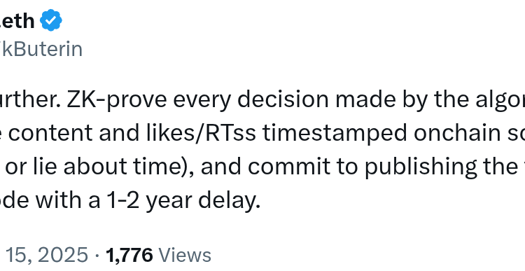 Buterin suggested a verifiable system that employs ZK-proofs for every decision made by the algorithm and timestamps all content, likes, and retweets on a blockchain “so the server can’t censor or lie about time.” The platform should also “commit to publishing the full algorithm code with a 1-2 year delay.”