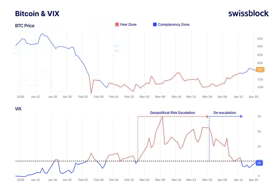 A rising VIX is typically bearish for risk assets like Bitcoin. However, that correlation broke briefly in March, according to a chart highlighted by wealth management firm Swissblock.