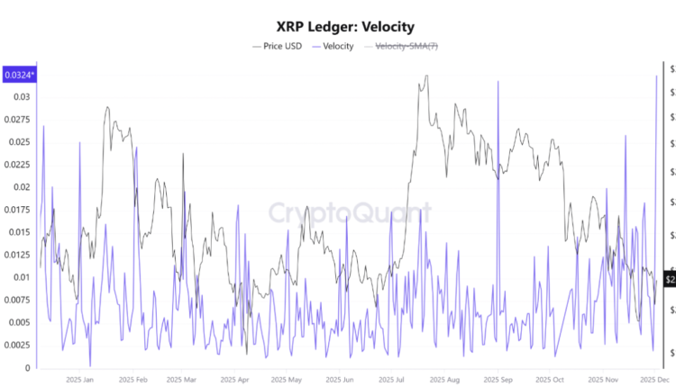 XRP ledger’s velocity rose has seen a sudden spike, rising to a yearly high of 0.0324 on Dec. 3, per data from CryptoQuant.