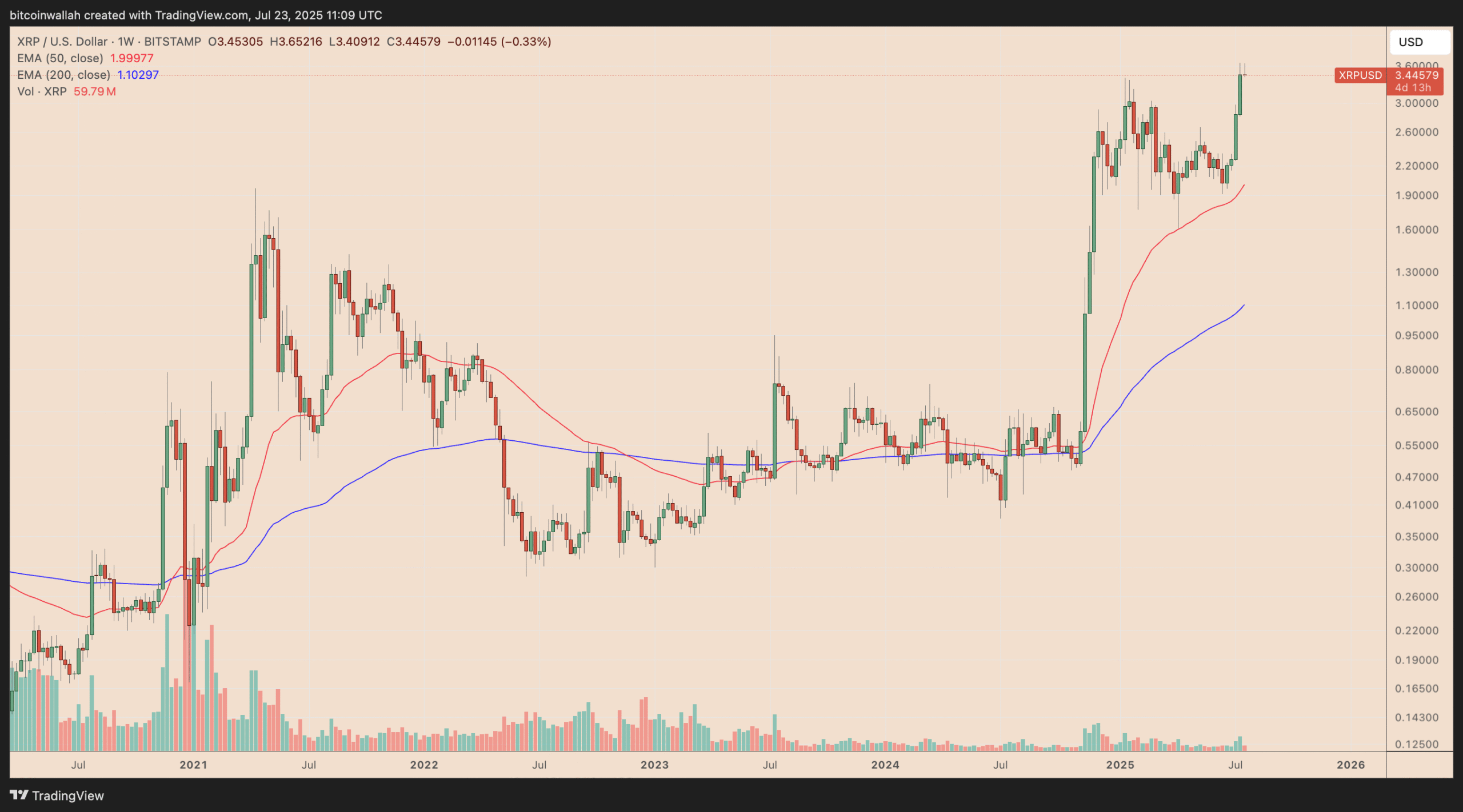 XRP is currently holding above the 50-day exponential moving average (50-day EMA; the red wave), reinforcing bullish bias.