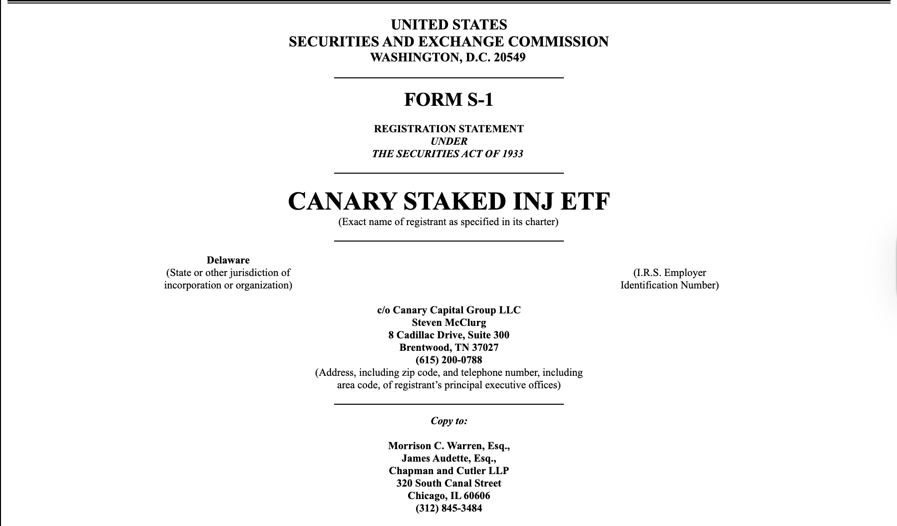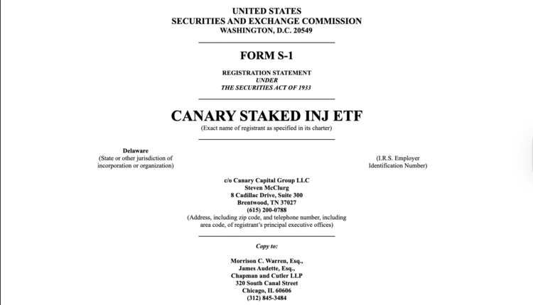 Investment company Canary Capital filed an S-1 application for a staked INJ (INJ) exchange-traded fund (ETF) with the United States Securities and Exchange Commission (SEC) on Thursday.