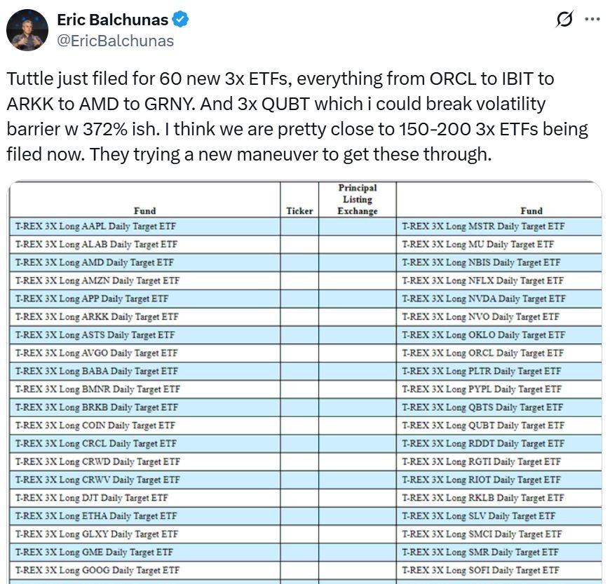 ETF issuer Tuttle Capital filed for 60 new 3x ETFs. Another ETF issuer, GraniteShares, also submitted a batch of ETF applications holding a range of assets, including Bitcoin (BTC) and Ether (ETH). ProShares also entered the fray with a slew of filings.