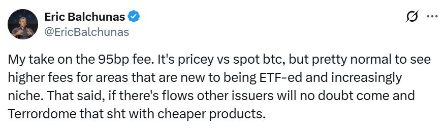“My take on the 95bp fee. It’s pricey vs spot BTC, but pretty normal to see higher fees for areas that are new to being ETF-ed and increasingly niche,” he said.
