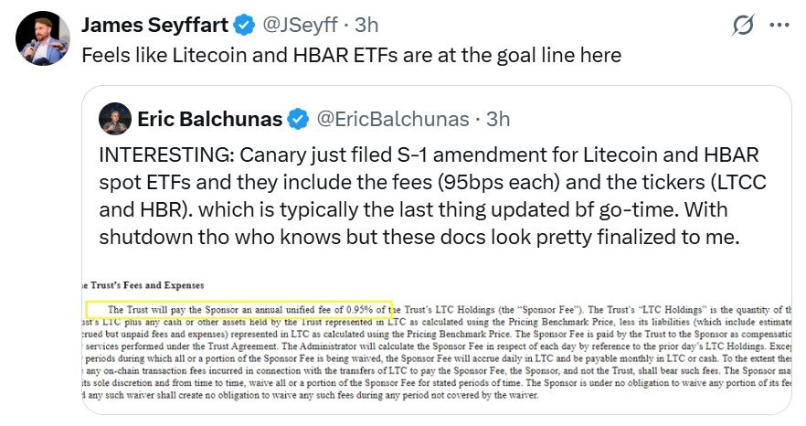 Fellow Bloomberg ETF analyst James Seyffart also thought the amendments are a good sign that an approval would happen and said it “feels like Litecoin and HBAR ETFs are at the goal line here.”