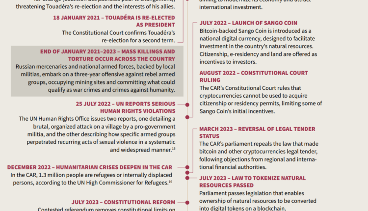 In the report titled “Behind the blockchain: Cryptocurrency and criminal capture in the Central African Republic,” researchers claimed that the CAR’s crypto ventures, from adopting Bitcoin (BTC) as legal tender to launching Sango Coin and the CAR memecoin, were rolled out in a fragile state with limited electricity, internet access and oversight.