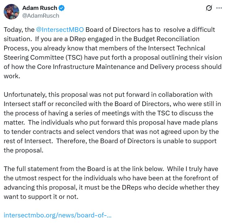 Adam Rusch, a member of Intersect’s board of directors, said in an April 28 post to X, that it would be left up to the community which proposal to support.